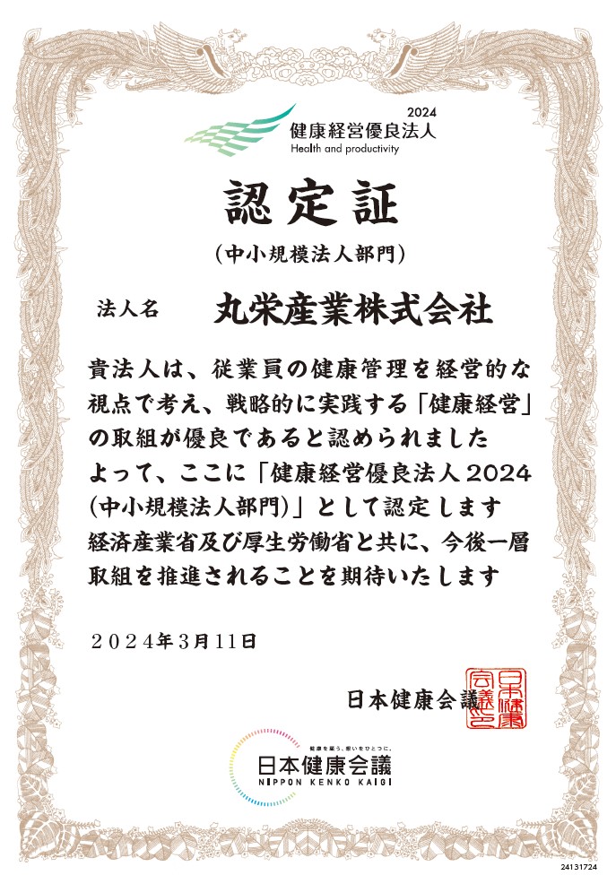 このたび、経済産業省と日本健康会議が推進する「健康経営優良法人認定制度」において、『健康経営優良法人2024(中小規模法人部門)』に認定されました。