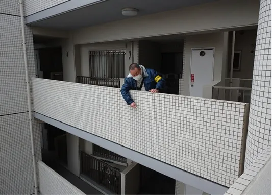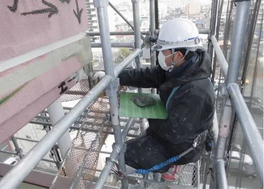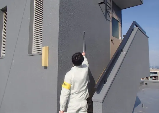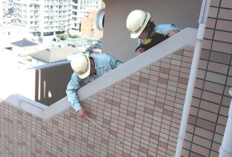 タイル面やモルタル面の表面を打診棒を使って叩いていきます。その打診音の変化により、浮いている部分やその度合を調査します。