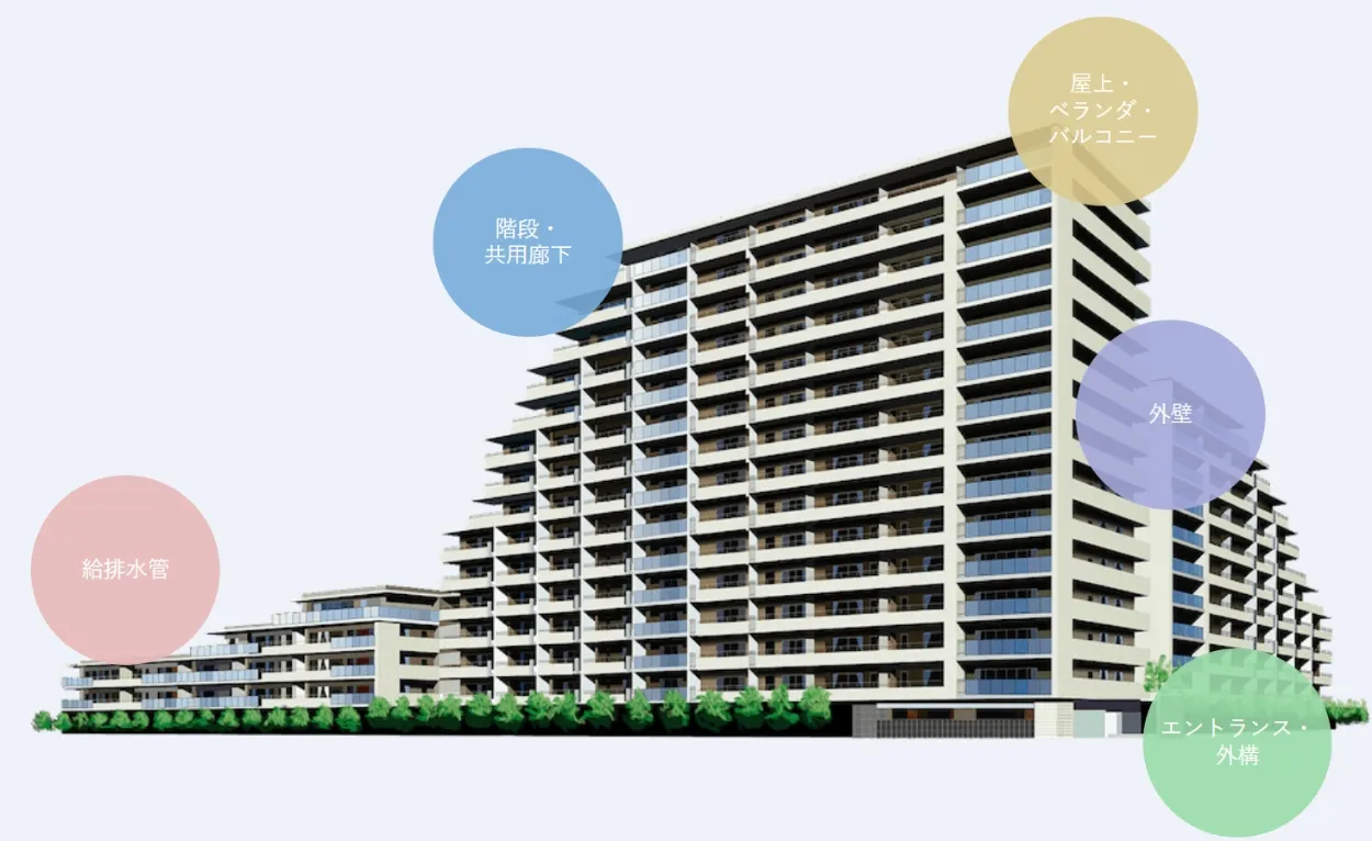 建物はいくら頑丈に造られていても、経年による劣化は避けられません。住む人の安全や快適な暮らしを保つためには、大規模改修工事が必要不可欠です。また建物の美観を保ち、現代の生活様式に合わせて機能を整えることで資産価値を維持することができます。次の図では、具体的にどのような改修工事があるのか、その一部を紹介しております。