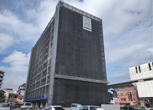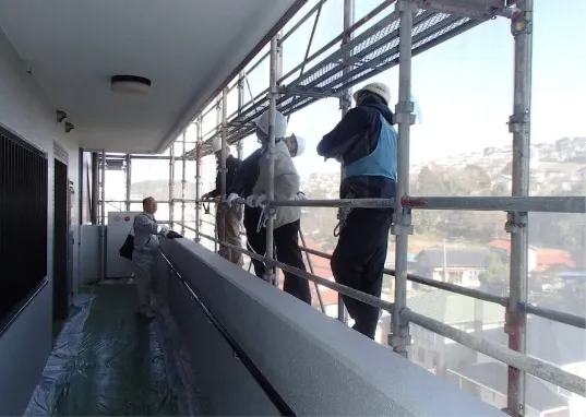 はじめに、建物全体に足場の仮設を行います。足場仮設後はメッシュシートで全体を覆って、塗料や埃等が外部へ飛散するのを防ぎます。また、現場事務所や作業員休憩所、資材倉庫、仮設トイレ等を設置します。
