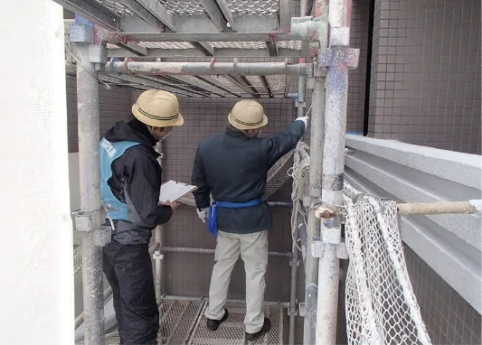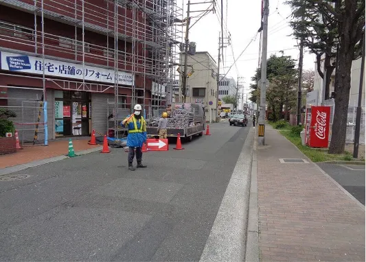 足場工事中は最も危険が伴うため、警備員を配置して居住者様や近隣住民の皆様の安全を第一に作業を進めます。 -
