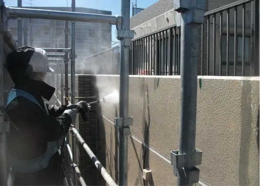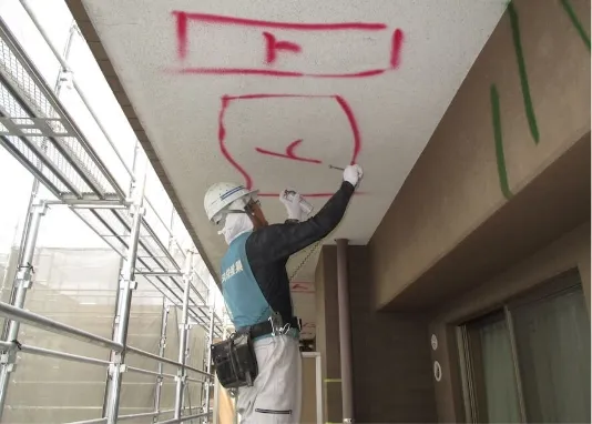 ⬛︎ 塗装面ひび割れや塗膜浮き、爆裂・欠損部などの補修を行います。ひび割れ部は大きさや状況により、フィラーすり込み工法やUカットシーリング工法など適切な工法で補修します。また、爆裂・欠損部は脆弱部をすべて除去し、鉄筋に防錆剤を塗布して、モルタルで埋め戻します。