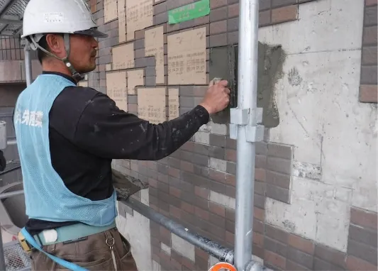 ⬛︎ タイル面タイルが浮いて落下する危険がある箇所やひび割れが入っている箇所などの補修を行います。浮いている箇所はエポキシ樹脂を注入して固定したり、不具合部はすべて撤去して張り替えていきます。