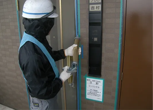 窓や扉など建具廻りや外壁の打継目地などのシーリング打替を行います。建具廻りのシーリング打替の際は特に、居住者様が誤って触って汚れてしまうということがないようにお知らせを掲示して注意喚起を行うなどしています。