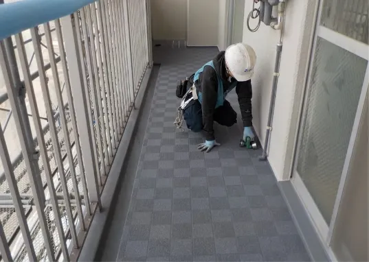 ベランダの防水性を高め、雨の日でも滑りにくく騒音軽減に優れたシートを貼り付けます。