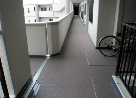 廊下の防水性を高め、雨の日でも滑りにくく騒音軽減に優れたシートを貼り付けます。